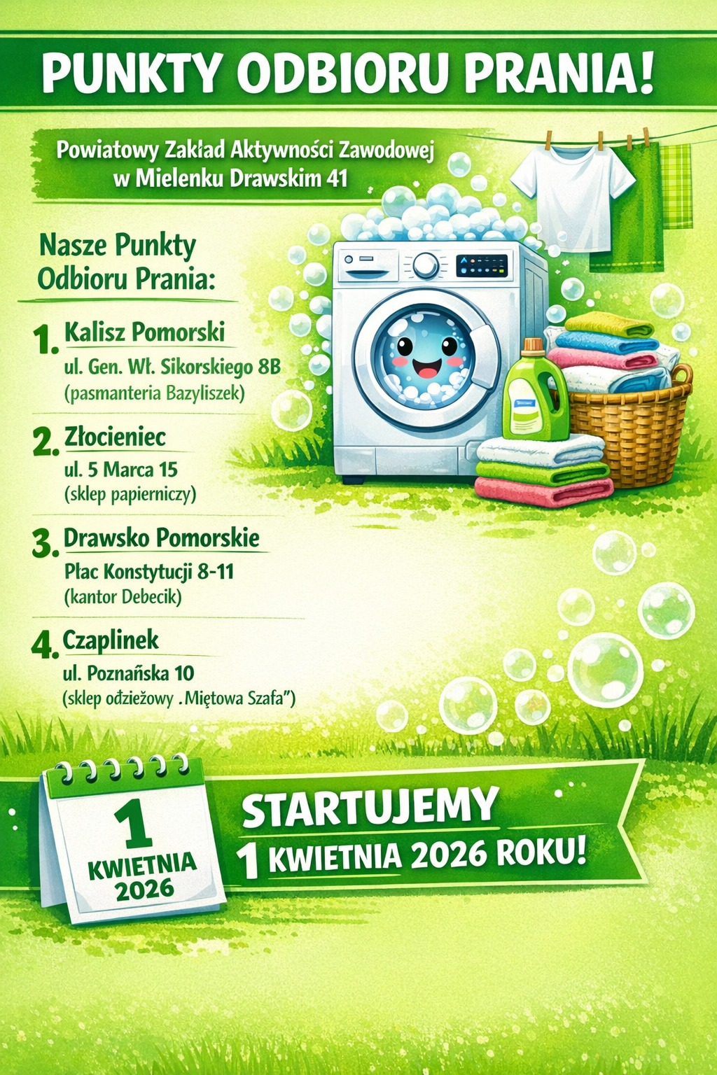 Od 1 kwietnia będą czynne punkty odbioru prania w Czaplinku, Drawsku Pom, Złocieńcu, Kaliszu Pom.
